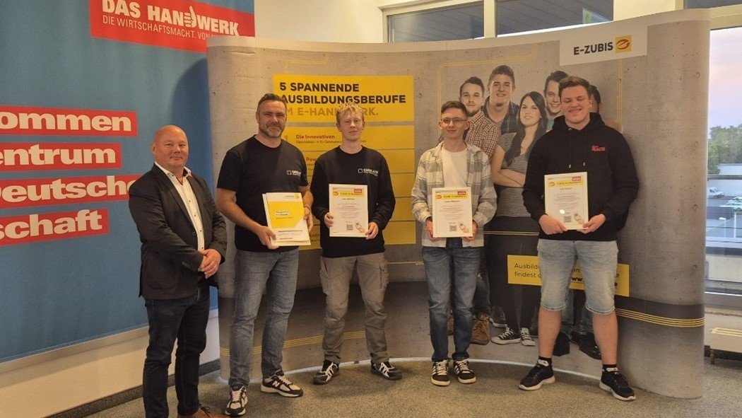 v. l. Obermeister Reik Hoffmann, Elektro-Innung Parchim und neue Azubis